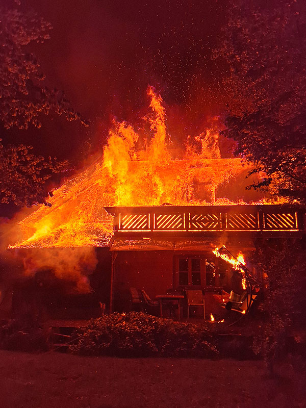 An zwei Hausfronten stand ein Wohngebäude in Mining beim Eintreffen der Feuerwehr bereits in Vollbrand. Kokosfaser als Dämmstoff sorgte für Normale Brandfähigkeit desselben – das machte es nicht einfacher!