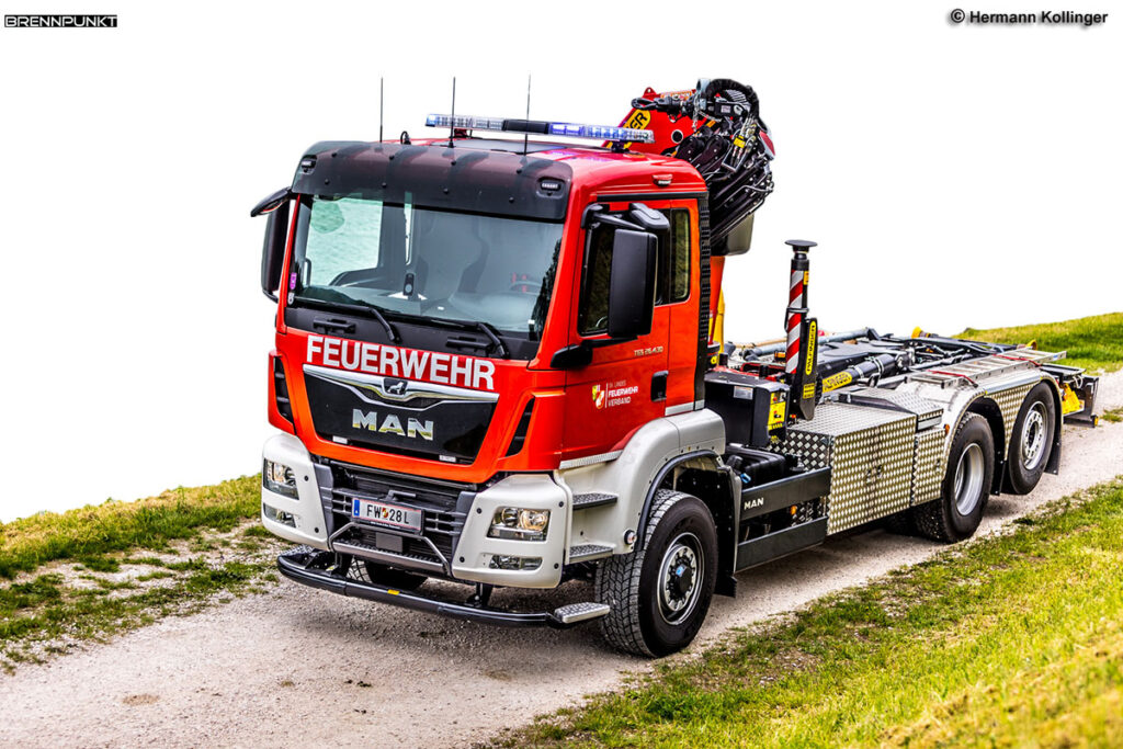 Der Vierachser bringt übrigens mit dem höchstzulässigen Gesamtgewicht 32 Tonnen auf die Waage, fünf weitere Tonnen mit Routengenehmigung. Inklusive dem Abrollbehälter ist eine Nutzlast von sieben Tonnen möglich, wobei die technische Nutzlast noch um 7.000 weitere Kilogramm höher liegt. Um diese technisch mögliche Zusatzlast auch ausreizen zu können, wurde vom Landes-Feuerwehrverband erfolgreich eine Routengenehmigung beantragt. Somit ist eine Ladung von zehn Tonnen zulässig! Für den Abrollbehälter mit Vertikallift auch vorgesehen bzw. darauf verladen sind Zusatzausrüstungsgegenstände wie Arbeitskorb, Schalengreifer, Holzgreifer, Palettengabel, Hebetraversen für Pkw und Lkw sowie Unterlegeholz, Endlosschlaufen und mehr.
