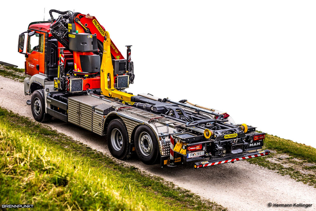 Das 3-achsige WLF-K1 KS (wurde im Brennpunkt bereits detailliert vorgestellt) verfügt über einen 15-Tonnen-Hakenlift zur Aufnahme der Abrollbehälter. Der mittelschwere Kran hebt bis zu 6,2 Tonnen, hat eine max. Ausladung von 17,1 m, eine Kranseilwinde, ist technisch auf dem neuesten Stand und standardmäßig für Herausforderungen aller Art mit Zubehörgeräten wie Endlosrotator, Holzgreiferzange, Arbeitskorb, Schüttgutgreifer und Palettengabel ausgestattet.