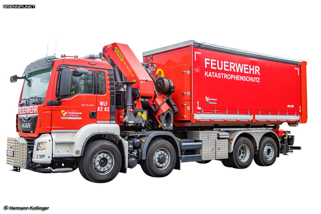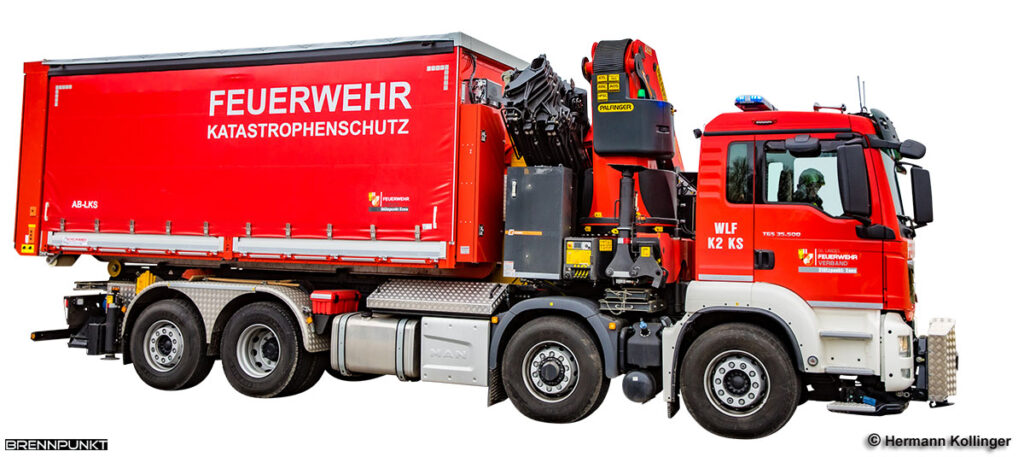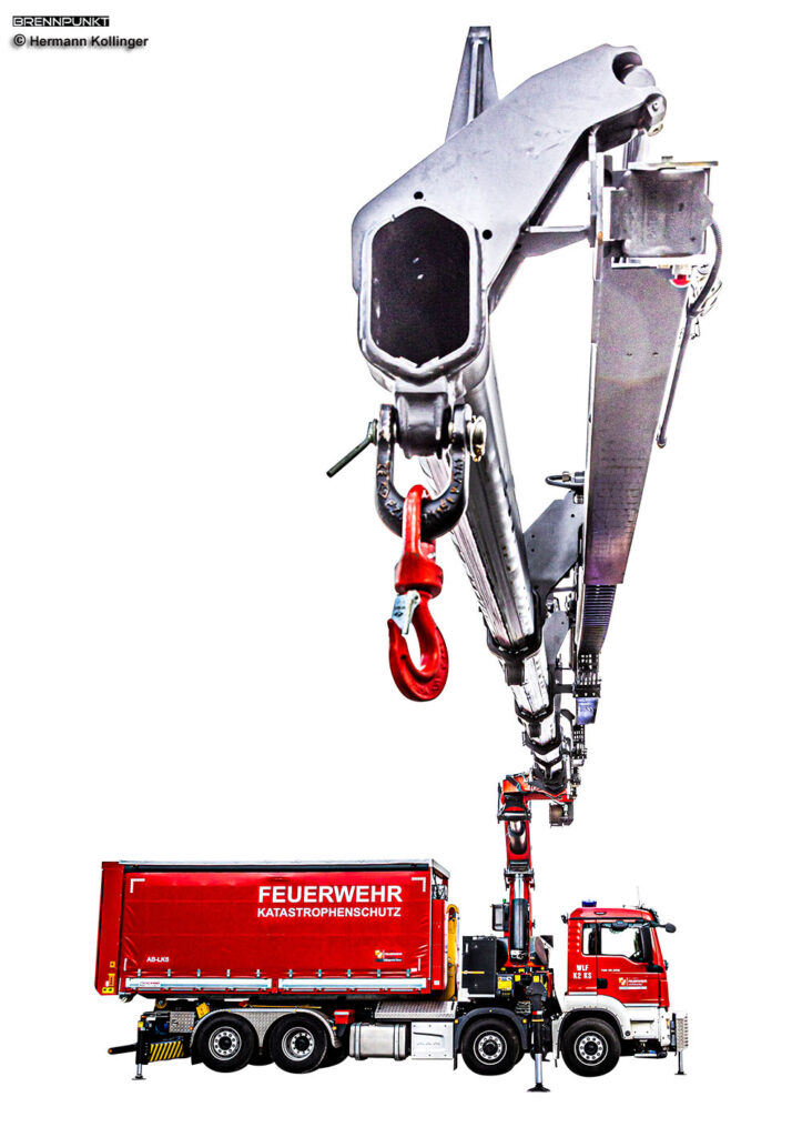 Mit dem WLF-K2 gelangen wir in die schwere Kran-Klasse und zu einem Vierachs-Fahrgestell. Eines der Kernstücke, das 2020 beim Prototyp der Feuerwehr Enns (Bezirk Linz-Land) auf dem 368 kW (500 PS) MAN TGS 35.500 8x4H-6 BL Fahrgestell mit knapp 26 Tonnen Eigengewicht gleich ins Auge sticht, ist der 74 Meter-Tonnen-Kran von Palfinger (PK-78002SH-G). In ihm liegt auch die Hauptaufgabe des Vierachsers. Seine Kraftpotenzial erlaubt beispielsweise das Heben eines knapp 7,4 Tonnen schweren Fahrzeuges auf 9 m Ausladung oder eines 3,5 Tonnen schweren Gegenstandes auf 16 m Ausladung. Bei „Person unter Lkw“ sind bei Minimalausladung des Krans 20 Tonnen Hubkraft drin.